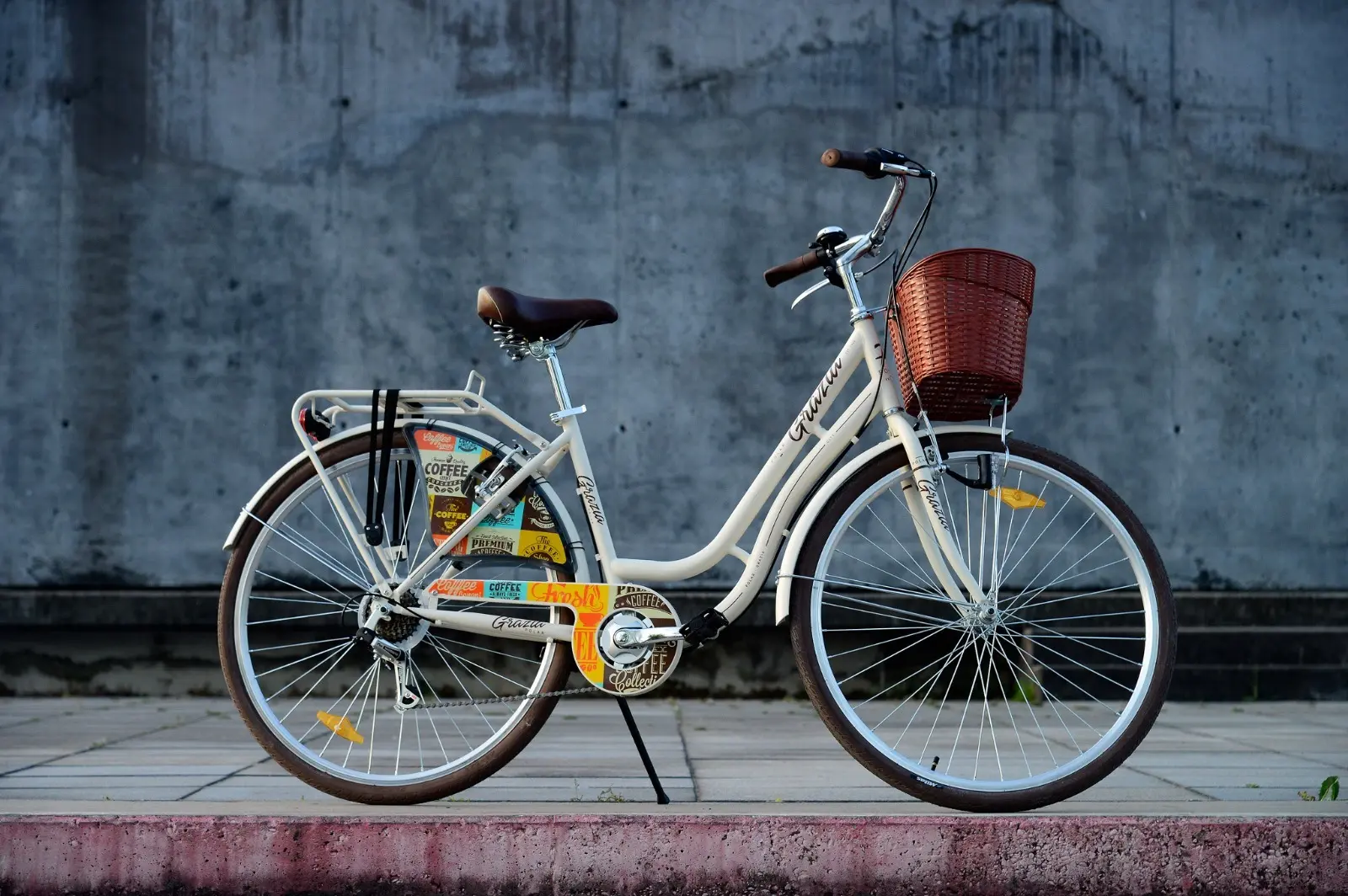 Grazia je opremljena mnogim korisnim dodacima koji značajno poboljšavaju udobnost bicikliranja. Košara sprijeda i nosač tereta straga pružaju brojne mogućnosti za siguran transport vaših stvari, što je vrlo zgodno i štoviše, košara jednostavno izgleda sjajno! Iznad kotača nalaze se blatobrani u boji koji štite biciklista od vode i prljavštine. Štitnik za suknju u uzorku modela. Tu je i rasvjeta koja jamči odgovarajuću vidljivost i sigurnost u vožnji po mraku.